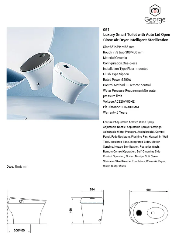 051 Luxury Smart Toilet with Auto Lid Open Close Air Dryer Intelligent Sterilization for Bathroom Projects