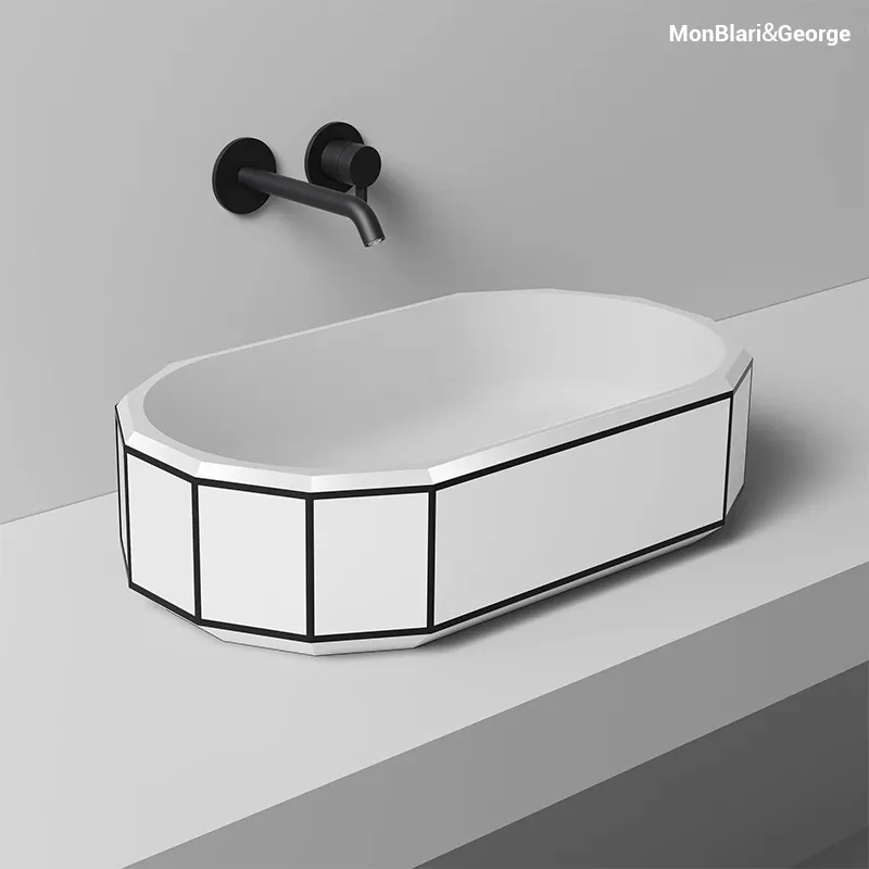 BERYL Matte White Solid Surface Vessel Sink | Diamond Faceted Design with Black Rim | MR-A86611