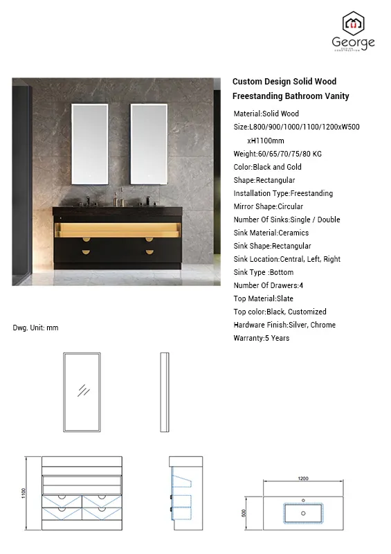 This freestanding bathroom vanity combines luxury with modern functionality. Featuring a striking black and gold design, the vanity is crafted from solid wood for long-lasting durability. The slate countertop pairs with a ceramic basin, available in both single and double sink options, to fit different bathroom needs. Its modern aesthetic adds sophistication to any bathroom space.