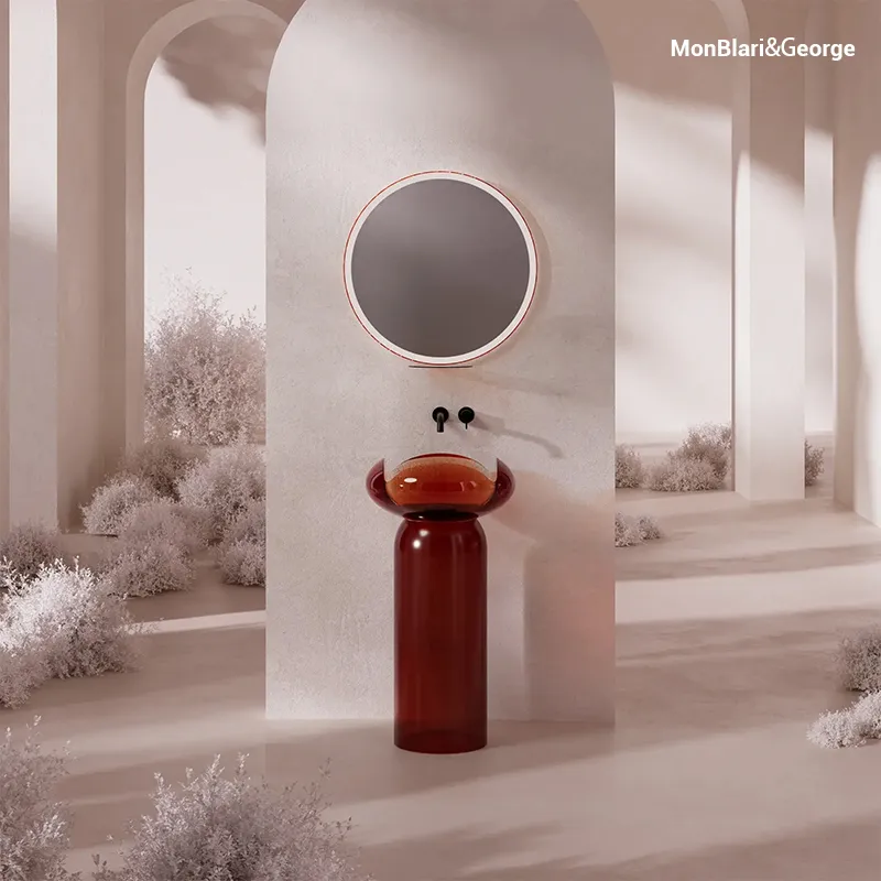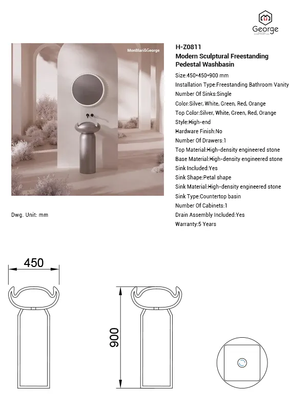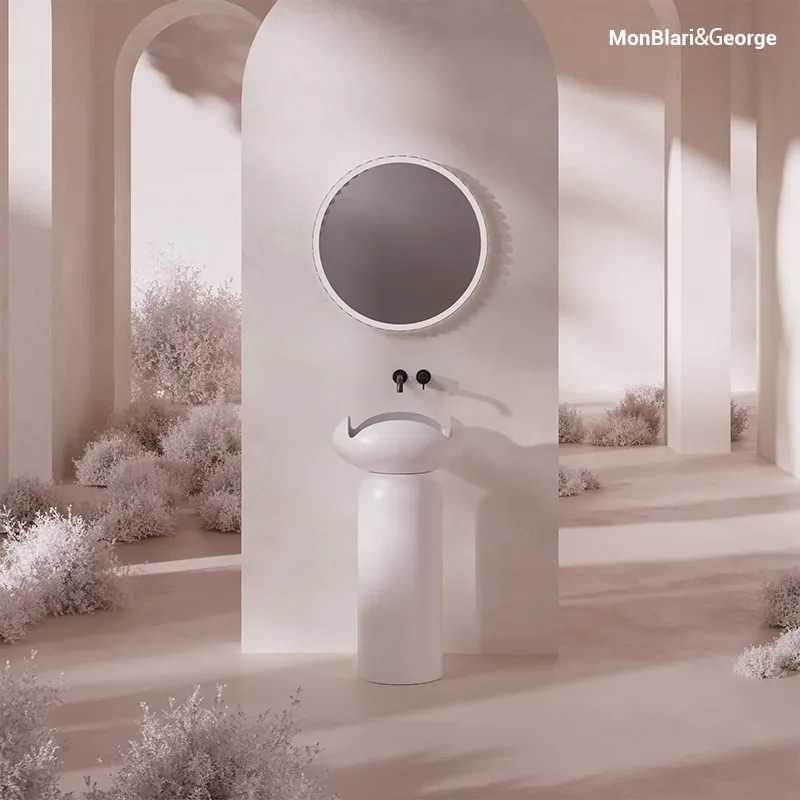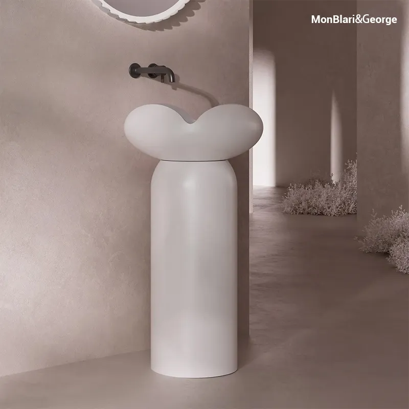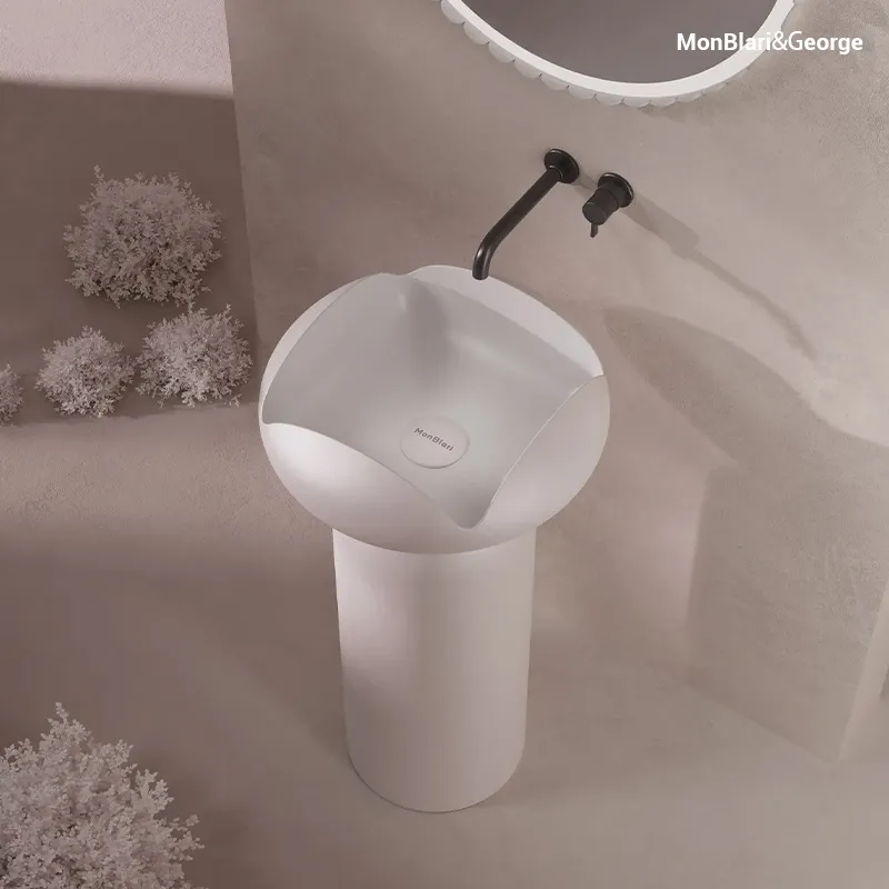 MonBlari FLOWER Series Solid Surface Pedestal Sink (Model H-Z0811) — a sculptural, one-piece pedestal basin inspired by tulip petals. The seamless matte form blends “Heaven is round, Earth is square” philosophy with modern minimalism, delivering a durable, yellow-resistant surface and museum-grade design for premium bathrooms.