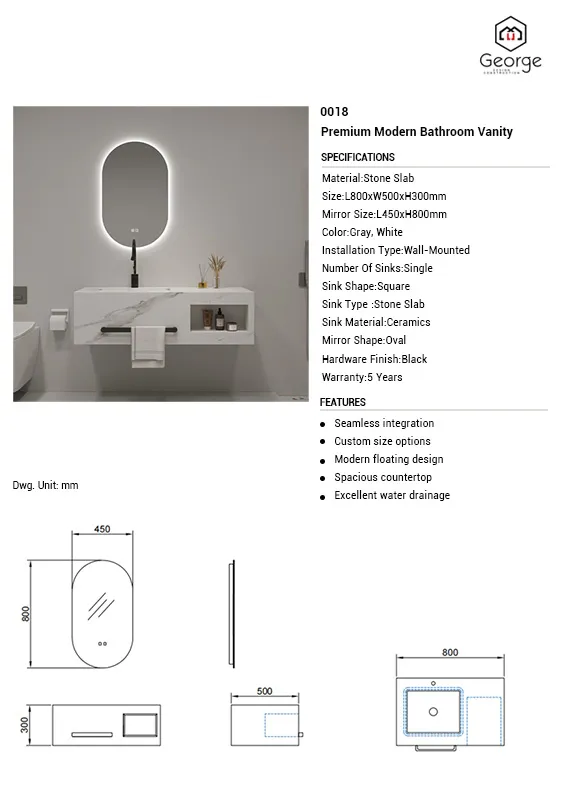 | Feature | – Seamless integration – Custom size options – Modern floating design – Spacious countertop – Excellent water drainage |