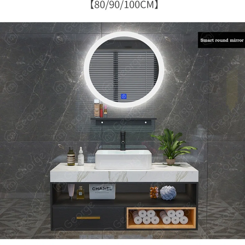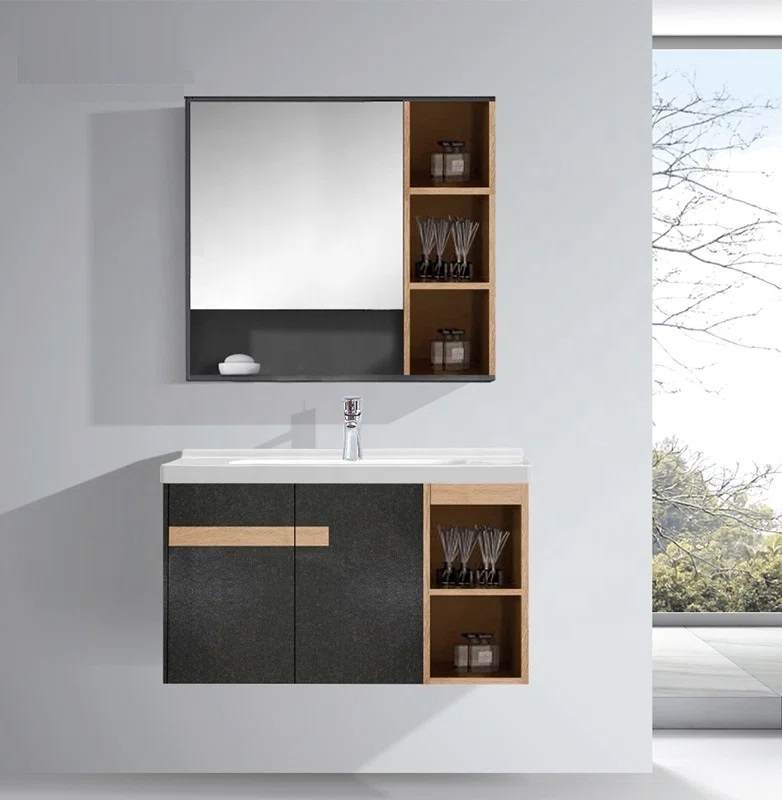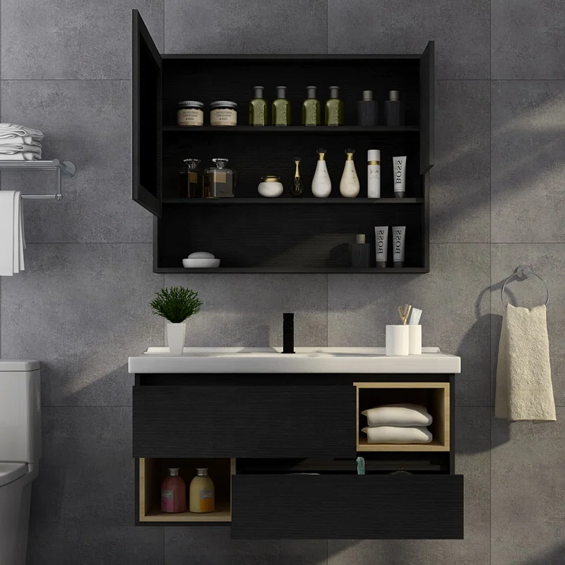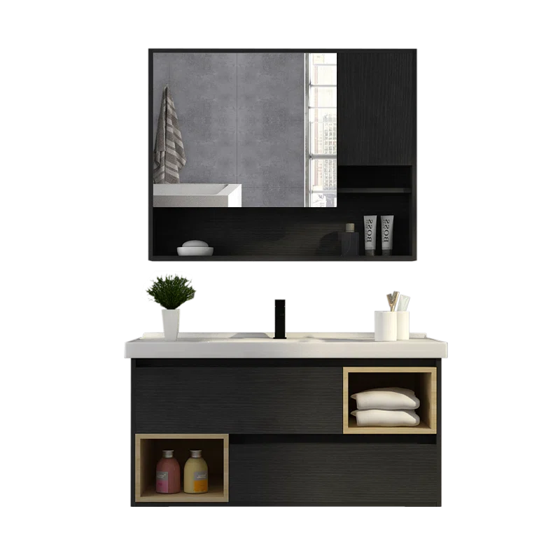 This modern bathroom vanity brings sleek style and smart organization to your bathroom. With a black wood-textured finish accented by open golden shelves, it offers both elegance and practicality. The sintered stone countertop integrates seamlessly with a ceramic sink, while the upper mirrored cabinet provides additional storage and a clean, refined look.