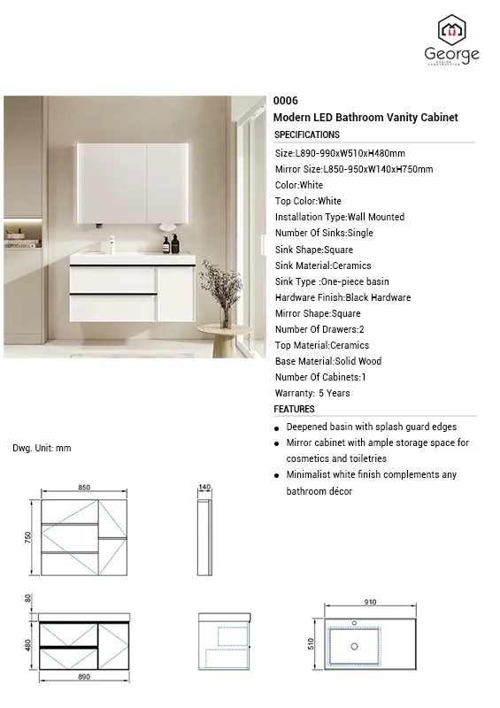 Feature Deepened basin with splash guard edges, Mirror cabinet with ample storage space for cosmetics and toiletries, Minimalist white finish complements any bathroom dรฉcor