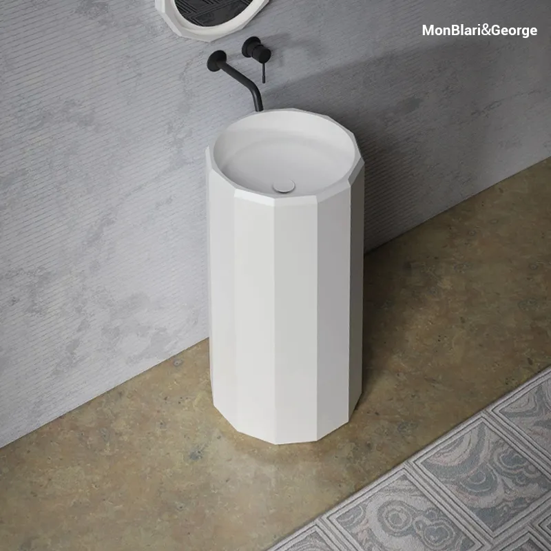 The MonBlari BERYL Series Round Pedestal Sink is more than a washbasin; it is a statement of architectural precision. Inspired by the art of gemstone cutting, this freestanding sink features a unique faceted exterior that plays with light and shadow, contrasting beautifully with its smooth, ergonomic round inner bowl. Crafted from high-density solid-surface material using seamless one-piece casting, it offers a velvety matte finish that is as durable as it is luxurious. Ideally suited for luxury residences and boutique hotels, the BERYL sink brings geometric purity and artisanal craftsmanship to the modern bathroom.