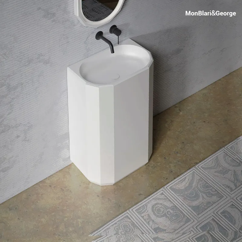 MonBlari BERYL Wall-Mounted Pedestal Sink – Matte White Solid Surface, Geometric Diamond-Cut Basin, Modern Luxury Bathroom (H-MR-Z86606)