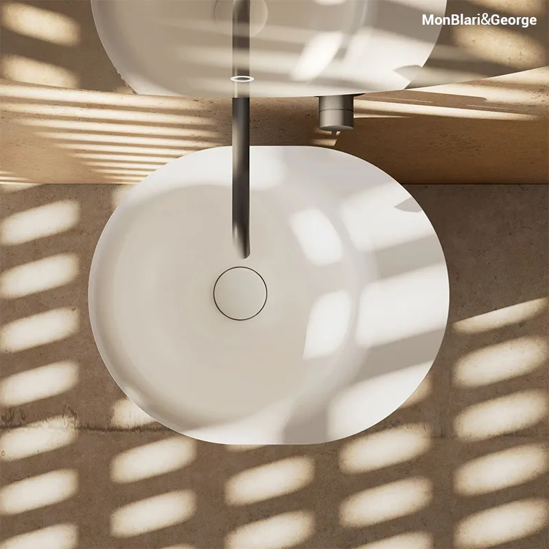 Each sink is meticulously hand-finished by MonBlari artisans, resulting in a subtle stone-like texture that resonates with the FOREST Series’ natural design philosophy. The matte surface diffuses light gently across the form, expressing the warm tranquility characteristic of the collection.
