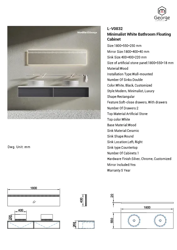 MonBlari LINGLONG Series L-V0832 Minimalist White Bathroom Floating Cabinet with Countertop Basins