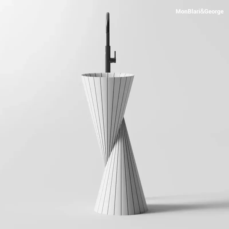 MonBlari SWING Series Pedestal Sink | White Artificial Stone Freestanding Basin with Hand-Inlaid Resin Stripes | Modern Bathroom Fixture S-Z0821