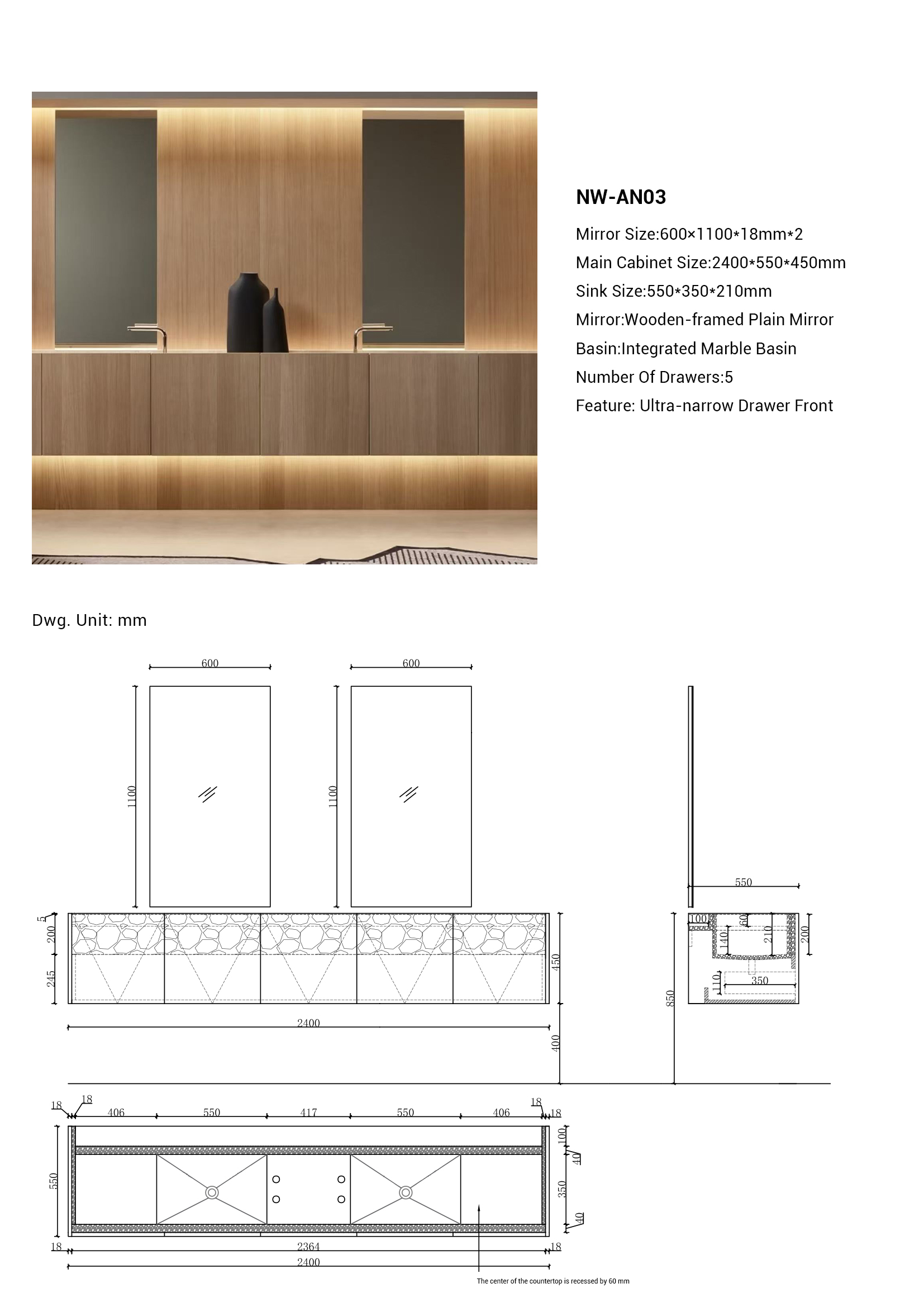 Drawer NW-AN03 Solid Wood Floating Bathroom Vanity Unit with Integrated Marble Surface Contertop and Double Basins