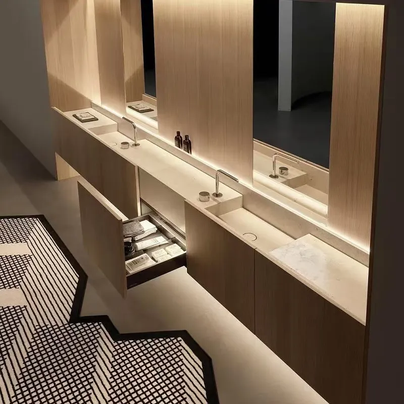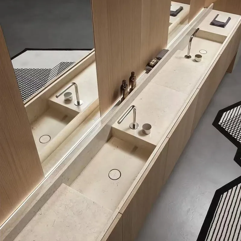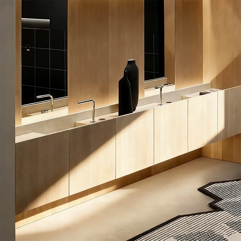 Two parallel linear elements define the washing area, creating a clear and organized layout. Variations in countertop height introduce rhythm and modularity, allowing the vanity to work seamlessly with bathtubs and countertops in coordinated bathroom designs.