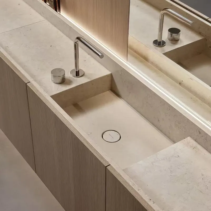In the cabinet version, the vanity blends harmoniously with the finishes, textures, and colors of the cabinet fronts, revealing its refined details only upon closer view. The suspended version, by contrast, fully showcases the stone material, allowing the natural character of the marble to be appreciated in its entirety.