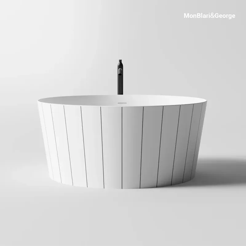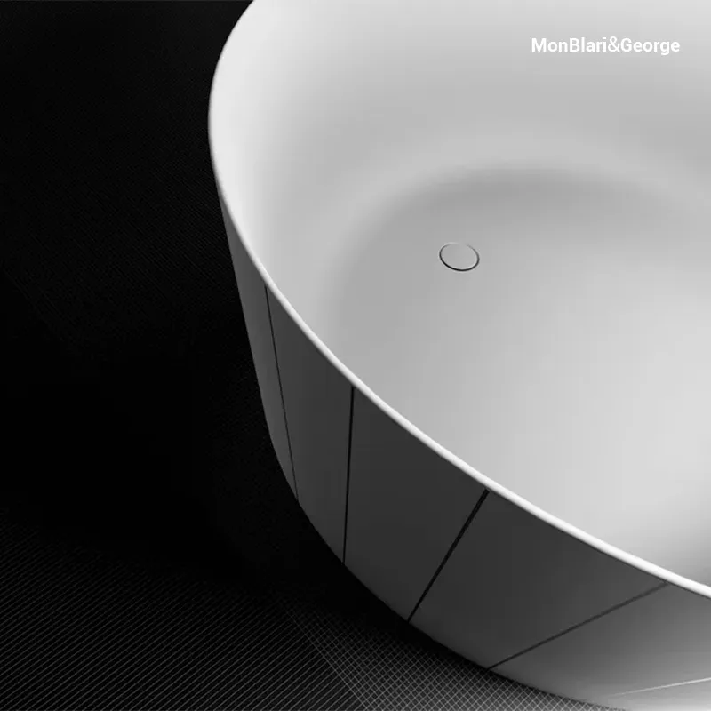 Immerse yourself in a masterpiece where art meets utility. Winner of the prestigious MUSE Design Award and French Design Award, the MonBlari SWING Series (Model S-0821) is more than just a bathtub—it is a sculptural statement inspired by the elegance of Italian swing dance. Crafted from premium white artificial stone, this freestanding tub features a unique conical geometry that balances dynamic movement with serene equilibrium. Its pristine surface is accentuated by hand-engraved vertical resin inlays, creating a visual rhythm that transforms your bathroom into a modern sanctuary of sophistication.