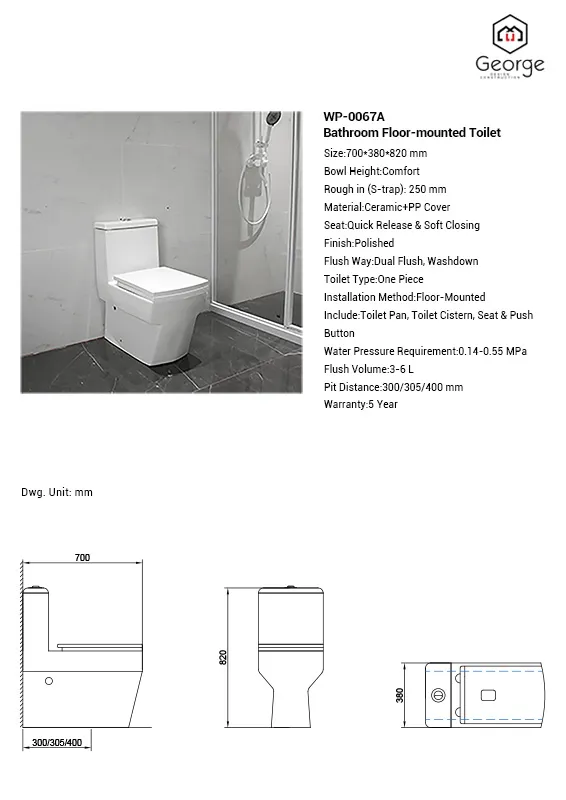 Designed for retailers who desire long-term popularity and high marketplace demand, our WP-0067A Toilet achieves high-style with leading-edge water conservation performance. Its high-efficient dual-flush system conserves water without sacrificing aggressive cleaning strength. It comfort-height, ergonomically designed seat is comfortable for the user, while the soft-close function enhances user satisfaction. Built with durable materials with easy-clean technology, this model guarantees long-term life ideal for residential and commercial use.