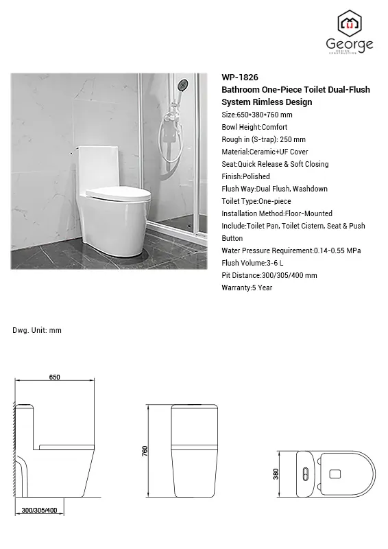 WP-1826 Bathroom One-Piece Toilet Dual-Flush System Rimless Design