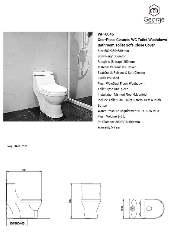 WP-8046 One-Piece Ceramic WC Toilet Washdown Bathroom Toilet Soft-Close Cover