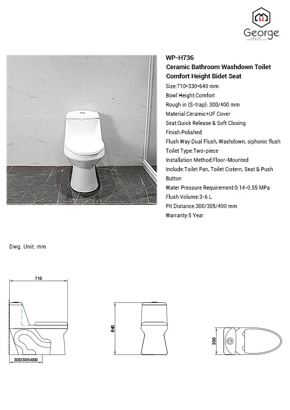 WP-H736 Ceramic Bathroom Washdown Toilet Comfort Height Bidet Seat Siphonic Flush System