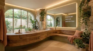 Unique bathroom vanity ideas in 2026 blend raw, natural materials with hidden technology. We are seeing a huge move toward modern bathroom vanity designs that use “wabi-sabi” textures and rounded corners to lower stress.